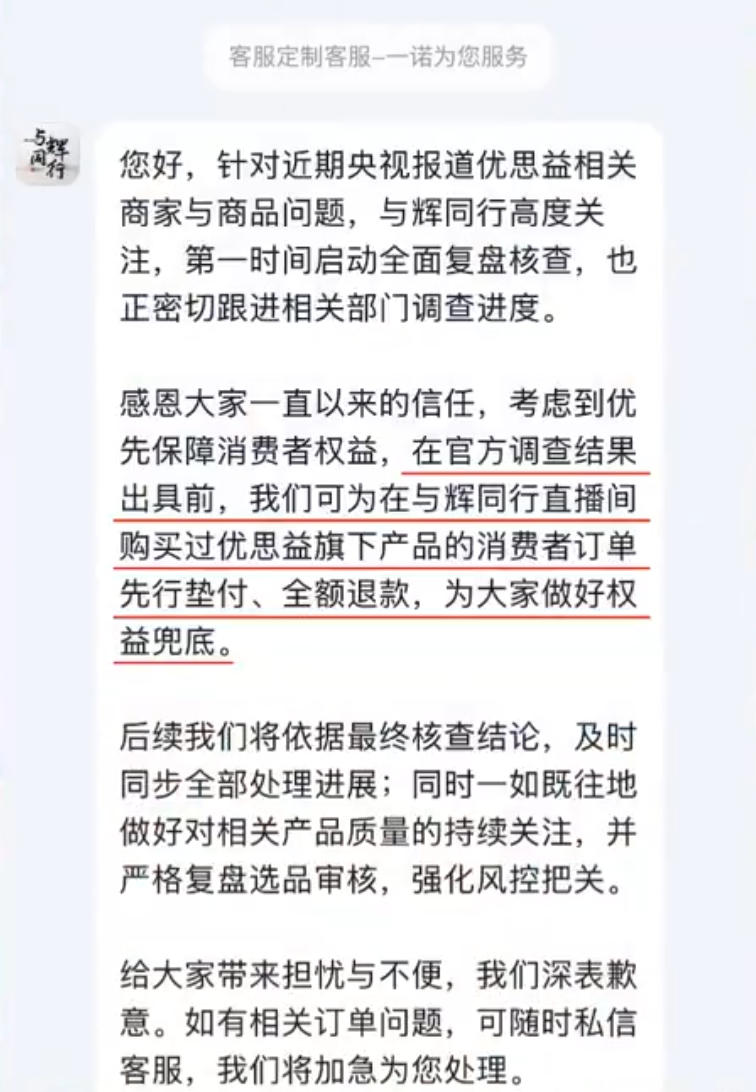 “感恩大家一直以来的信任,考虑到优先保障消费者权益,在官方调查结果出具前,我们可为在与辉同行直播间购买过优思益旗下产品的消费者订单先行垫付、全额退款,为大家做好权益兜底。”与辉同行称。